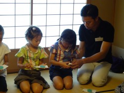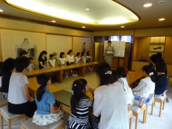 夏休みに入った7月31日、親子茶道体験教室を開催しました。相模大野近辺をはじめ、遠くは新潟からもご参加いただき大変賑やかな教室でした。数年前にお仕事の関係で御引越しされたお弟子さんも今日は親子でご参加。茶室見学、お点前見学、お菓子とお茶をいただき、その後みんなでお茶を点ててみました。お茶の葉から、抹茶ができる過程も見学。最後にご飯、お味噌汁、お漬物を頂きながら、お食事の基本作法を実習。懐かしい再会や子供たちとの新しい出会いに暑い夏を吹き飛ばすパワーをいただいて無事終了。ご参加いただきました皆様ありがとうございました。