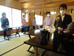 3月よりお休みしておりました茶道教室を再開いたしました。皆様との再会に感謝し、無事に残りの半年を過ごせますように、夏越の祓いをテーマに立礼茶事を行いました。